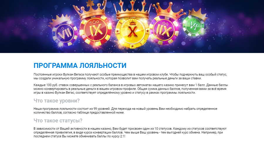 Бывалые игроки комментируют VIP-программу Vulkan Vegas casino и отмечают, что 99 ступеней успеха гораздо более интересны, чем 5 или 6. Так как цели для поднятия на следующий уровень более достижимы.